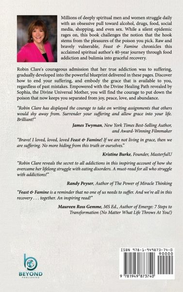 Millions of deeply spiritual men and women struggle daily with an obsessive pull toward alcohol, drugs, food, social media, shopping, and even sex. While a silent epidemic rages on, this book challenges the notion that the hook stems from the pleasures of the poison you pick. Raw and bravely vulnerable, Feast & Famine chronicles this acclaimed spiritual author's 40-year journey through food addiction and bulimia into graceful recovery. Robin Clare's courageous admission that her true addiction was to suffering, gradually developed into the powerful blueprint delivered in these pages. Discover how to end your suffering, and embody the grace that is available to you, regardless of past mistakes. Empowered with the Divine Healing Path revealed by Sophia, the Divine Universal Mother, you will find the courage to put down the poison that now keeps you separated from joy, peace, love, and abundance. Robin Clare is available to be a guest on online forums, podcasts, and Zoom calls, as well as to speak to groups, associations, and to be a featured guest on panels. To learn more about scheduling Robin Clare for your next online or live event, please go to Clare-ity.com.
