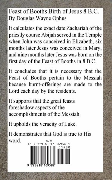 It calculates the exact date Zachariah of the priestly course Abijah served in the Temple when John the Baptist was conceived in Elizabeth, six months later Jesus was conceived in Mary, and nine months later Jesus was born on the first day of the Feast of Booths in 8 B.C. It concludes that it is necessary that the Feast of Booths pertain to the Messiah because burnt offerings are made to the Lord each day by the residents. It supports that the great feasts foreshadow aspects of the accomplishments of the Messiah. It upholds the veracity of Luke. It demonstrates that God is true to His word. It is correct and exact. It calculates the dates of service of the priestly course of Abijah from 1 B.C. to 9 B.C.