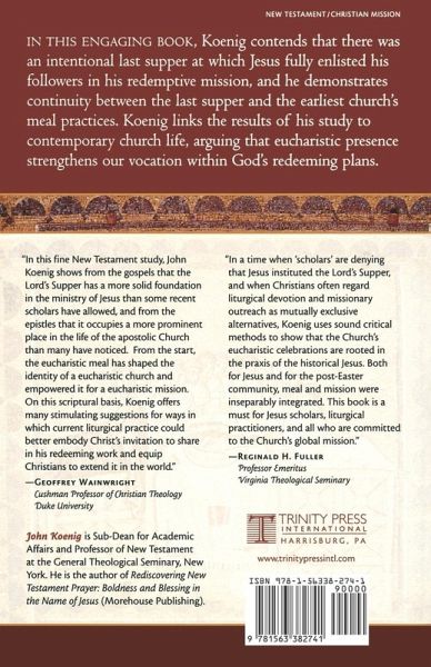 Contrary to some contemporary scholarship, John Koenig argues that there was an intention "Last Supper" at which Jesus, with a messianic consciousness, intended to enlist his followers more fully in his redemptive mission.>