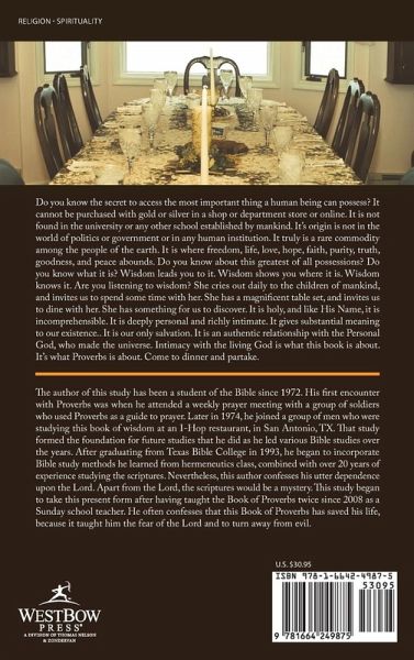 Do you know the secret to access the most important thing a human being can possess? It cannot be purchased with gold or silver in a shop or department store or online. It is not found in the university or any other school established by mankind. It's origin is not in the world of politics or government or in any human institution. It truly is a rare commodity among the people of the earth. It is where freedom, life, love, hope, faith, purity, truth, goodness, and peace abounds. Do you know about this greatest of all possessions? Do you know what it is? Wisdom leads you to it. Wisdom shows you where it is. Wisdom knows it. Are you listening to wisdom? She cries out daily to the children of mankind, and invites us to spend some time with her. She has a magnificent table set, and invites us to dine with her. She has something for us to discover. It is holy, and like His Name, it is incomprehensible. It is deeply personal and richly intimate. It gives substantial meaning to our existence.. It is our only salvation. It is an authentic relationship with the Personal God, who made the universe. Intimacy with the living God is what this book is about. It's what Proverbs is about. Come to dinner and partake.