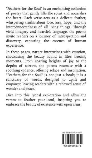 "Feathers for the Soul" is an enchanting collection of poetry that gently lifts the spirit and nourishes the heart. Each verse acts as a delicate feather, whispering truths about love, loss, hope, and the interconnectedness of all living things. Through vivid imagery and heartfelt language, the poems invite readers on a journey of introspection and discovery, capturing the essence of human experience. In these pages, nature intertwines with emotion, showcasing the beauty found in life's fleeting moments. From soaring heights of joy to the depths of sorrow, the poems resonate with a soothing cadence, offering solace and inspiration. "Feathers for the Soul" is not just a book; it is a sanctuary of words, designed to uplift and empower, leaving readers with a renewed sense of wonder and peace. Dive into this lyrical exploration and allow the verses to feather your soul, inspiring you to embrace the beauty of existence with open arms.