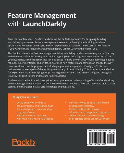 Make code deployments completely safe and change your application in production in real time with LaunchDarkly using percentage-based rollouts, kill switches, and A/B and multi-variant testing Key Features:Learn how to work with LaunchDarkly to turn features on and off within your production applications Explore the ways in which feature management can change how software is built and how teams work Master every aspect of LaunchDarkly's functionality to test in production and learn from your users Book Description: Over the past few years, DevOps has become the de facto approach for designing, building, and delivering software. Feature management is now extending the DevOps methodology to allow applications to change on demand and run experiments to validate the success of new features. If you want to make feature management happen, LaunchDarkly is the tool for you. This book explains how feature management is key to building modern software systems. Starting with the basics of LaunchDarkly and configuring simple feature flags to turn features on and off, you'll learn how simple functionality can be applied in more powerful ways with percentage-based rollouts, experimentation, and switches. You'll see how feature management can change the way teams work and how large projects, including migrations, are planned. Finally, you'll discover various uses of every part of the tool to gain mastery of LaunchDarkly. This includes tips and tricks for experimentation, identifying groups and segments of users, and investigating and debugging issues with specific users and feature flag evaluations. By the end of the book, you'll have gained a comprehensive understanding of LaunchDarkly, along with knowledge of the adoption of trunk-based development workflows and methods, multi-variant testing, and managing infrastructure changes and migrations. What You Will Learn:Get to grips with the basics of LaunchDarkly and feature flags Roll out a feature to a percentage or group of users Find out how to experiment with multi-variant and A/B testing Discover how to adopt a trunk-based development workflow Explore methods to manage infrastructure changes and migrations Gain an in-depth understanding of all aspects of the LaunchDarkly tool Who this book is for: This book is for developers, quality assurance engineers and DevOps engineers. This includes individuals who want to decouple the deployment of code from the release of a feature, run experiments in production, or understand how to change processes to build and deploy software. Software engineers will also benefit from learning how feature management can be used to improve products and processes. A basic understanding of software is all that you need to get started with this book as it covers the basics before moving on to more advanced topics.