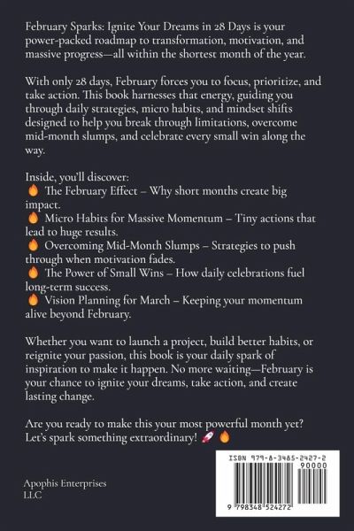 February Sparks: Ignite Your Dreams in 28 Days is your power-packed roadmap to transformation, motivation, and massive progress-all within the shortest month of the year. With only 28 days, February forces you to focus, prioritize, and take action. This book harnesses that energy, guiding you through daily strategies, micro habits, and mindset shifts designed to help you break through limitations, overcome mid-month slumps, and celebrate every small win along the way. Inside, you'll discover: ���� The February Effect - Why short months create big impact. ���� Micro Habits for Massive Momentum - Tiny actions that lead to huge results. ���� Overcoming Mid-Month Slumps - Strategies to push through when motivation fades. ���� The Power of Small Wins - How daily celebrations fuel long-term success. ���� Vision Planning for March - Keeping your momentum alive beyond February. Whether you want to launch a project, build better habits, or reignite your passion, this book is your daily spark of inspiration to make it happen. No more waiting-February is your chance to ignite your dreams, take action, and create lasting change. Are you ready to make this your most powerful month yet? Let's spark something extraordinary! ��������