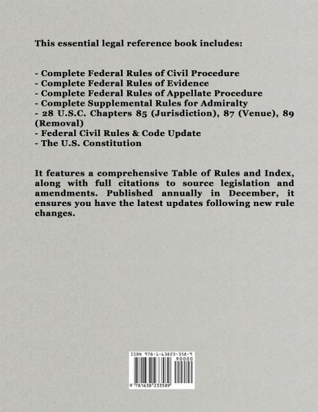 This essential legal reference book includes: - **Complete Federal Rules of Civil Procedure** - **Complete Federal Rules of Evidence** - **Complete Federal Rules of Appellate Procedure** - **Complete Supplemental Rules for Admiralty** - **28 U.S.C. Chapters 85 (Jurisdiction), 87 (Venue), 89 (Removal)** - **Federal Civil Rules & Code Update** - **The U.S. Constitution** It features a comprehensive Table of Rules and Index, along with full citations to source legislation and amendments. Published annually in December, it ensures you have the latest updates following new rule changes.