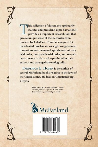 This collection of documents (primarily statutes and presidential proclamations), provide an important research tool that gives a unique sense of the Reconstruction process. Included are 37 acts of congress, 44 presidential proclamations, eight congressional resolutions, one inaugural speech, one military field order, one presidential order, and two war department circulars, all reproduced in their entirety and arranged chronologically.