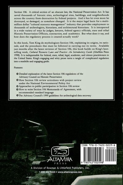 Part 1 One: Section 106: What is It and Where Did It Come From? Chapter 2 1. 106 of What? Chapter 3 2. Evolution of a Process Part 4 Two: Section 106 in the New Millennium Chapter 5 3. What's it All About? When Does it Happen? Who Plays? Chapter 6 4. The Game's Afoot! Initiating Review Chapter 7 5. Finding What May be Affected Chapter 8 6. Evaluation Chapter 9 7. The Results of Identification and Evaluation Chapter 10 8. Will There Be an Adverse Affect? Chapter 11 9. Resolving Adverse Affect Chapter 12 10. "Substituting" NEPA for Section 106 Chapter 13 11. The Rest of the Regulation Chapter 14 12. Summary Part 15 Three: Some Tools of the Trade Chapter 16 13. Public Participation Chapter 17 14. Writing a Memorandum of Agreement Chapter 18 15. The Invented Wheels: Standard Stipulation Part 19 Epilogue: The Future of 106 Chapter 20 Bibliography Chapter 21 Appendix A: A Walk Through the ACHP's Archaeological Guidance Chapter 22 Index