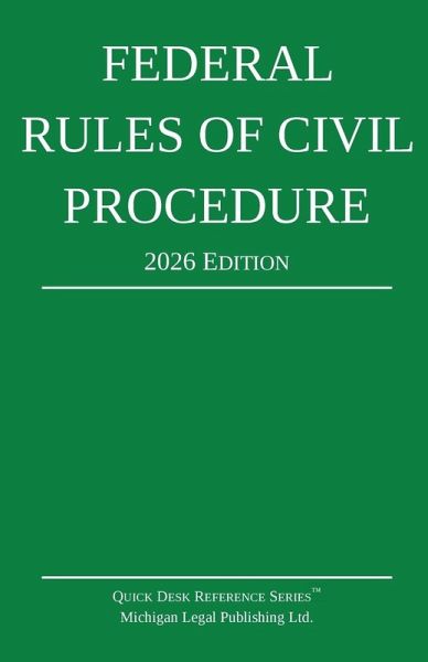 A concise and comprehensive edition of the Federal Rules of Civil Procedure and related selected statutes for quick reference. Updated through January 1, 2026. Perfect for your briefcase or desk and a great format for the attorney or law school student who simply needs to refer to the rules. Supplement for all casebooks. Contents: Federal Rules of Civil ProcedureTitle I. Scope of rules; form of action Title II. Commencing an action; service of process, pleadings, motions, and orders Title III. Pleadings and motions Title IV. Parties Title V. Disclosures and discovery Title VI. Trials Title VII. Judgment Title VIII. Provisional and final remedies Title IX. Special proceedings Title X. District courts and clerks: conducting business; issuing orders Title XI. General provisions Title XII. Appendix of forms (abrogated) Title XIII. Supplemental Rules for Admiralty or Maritime Claims and Asset Forfeiture Actions Statutory Supplement28 USC Chapter 85-District Courts; Jurisdiction 28 USC Chapter 87-District Courts; Venue 28 USC Chapter 91-District Courts; Removal of Cases from State Courts