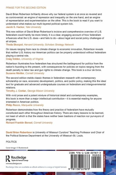 ¿ Though Americans rarely appreciate it, federalism has profoundly shaped their nation's past, present, and future. Federalism-the division of government authority between the national government and the states-affects the prosperity, security, and daily life of every American. Some of the most spectacular political conflicts in American history have been fought on the battlefield of federalism, including states' rights to leave the union, government power to regulate business, and responses to the problems of race, poverty, pollution, abortion, and gay rights. In the second edition of this nuanced and comprehensive text, David Brian Robertson shows that past choices shape present circumstances, and that a deep understanding of American government, public policy, political processes, and society requires an understanding of the key steps in federalism's evolution in American history. New to the Second Edition Emphasizes that federalism is a battleground that shapes every life inAmerica. Extensively revised and updated, including new coverage of recent controversies like Ferguson, immigration, climate change, Obamacare, gay rights, the minimum wage, political polarization, voter identification, fracking, and marijuana legalization. Brings together the newest developments in history, political science, law,and related disciplines to show how federalism influences government and politics today. Includes chapter-opening vignettes that deal with contemporary cases and policy challenges. ¿