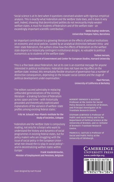 'Social science is at its best when it questions conceived wisdom with rigorous empirical analysis. This is exactly what Federalism and the Welfare State does, and it does it very well, indeed, showing that decentralized polities do not necessarily imply weaker welfare states. Written by some of the World's leading authorities, this book is a must for students of federalism and of the welfare state - an exceedingly important scientific contribution.' Goesta Esping-Andersen, Universitat Pompeu Fabra, Barcelona
