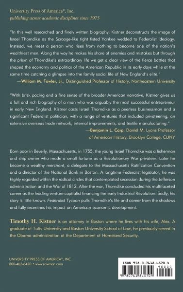 After the War of 1812, Thorndike concluded his career as the leading venture capitalist financing the early Industrial Revolution. Sadly, his story is little known. Federalist Tycoon pulls Thorndike's life and career from the shadows and fully examines his impact on American economic development.