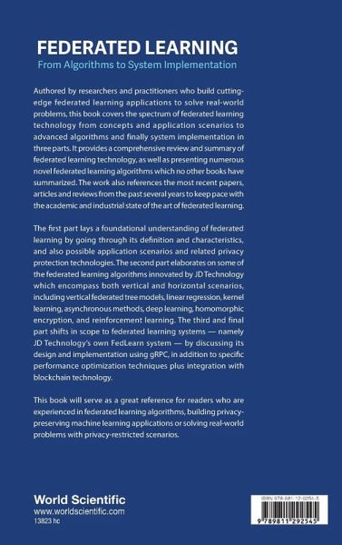 Authored by researchers and practitioners who build cutting-edge federated learning applications to solve real-world problems, this book covers the spectrum of federated learning technology from concepts and application scenarios to advanced algorithms and finally system implementation in three parts. It provides a comprehensive review and summary of federated learning technology, as well as presenting numerous novel federated learning algorithms which no other books have summarized. The work also references the most recent papers, articles and reviews from the past several years to keep pace with the academic and industrial state of the art of federated learning. The first part lays a foundational understanding of federated learning by going through its definition and characteristics, and also possible application scenarios and related privacy protection technologies. The second part elaborates on some of the federated learning algorithms innovated by JD Technology which encompass both vertical and horizontal scenarios, including vertical federated tree models, linear regression, kernel learning, asynchronous methods, deep learning, homomorphic encryption, and reinforcement learning. The third and final part shifts in scope to federated learning systems - namely JD Technology's own FedLearn system - by discussing its design and implementation using gRPC, in addition to specific performance optimization techniques plus integration with blockchain technology. This book will serve as a great reference for readers who are experienced in federated learning algorithms, building privacy-preserving machine learning applications or solving real-world problems with privacy-restricted scenarios.