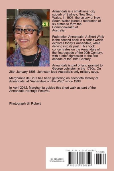 Annandale is a small inner city suburb of Sydney, New South Wales. In 1901, the colony of New South Wales joined a federation of six states to form the Commonwealth of Australia. Federation Annandale: A Short Walk is the second book in a series which explores today's Annandale, while delving into its past. This book concentrates on the Annandale of the first decade of the 20th Century, with a brief digression to the first decade of the 19th Century. Annandale is part of land granted to George Johnston in the 1790s. On 26th January 1808, Johnston lead Australia's only military coup. Marghanita da Cruz has been gathering an anecdotal history of Annandale, at "Annandale on the Web" since 1998. In April 2012, Marghanita guided this short walk as part of the Annandale Heritage Festival.