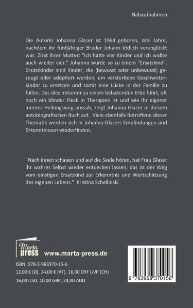 Die Autorin Johanna Glaser ist 1964 geboren, drei Jahre, nachdem ihr fünfjähriger Bruder Johann tödlich verunglückt war. Zitat ihrer Mutter: "Ich hatte vier Kinder und ich wollte auch wieder vier." Johanna wurde so zu einem "Ersatzkind". Ersatzkinder sind Kinder, die (bewusst oder unbewusst) gezeugt oder adoptiert werden, um verstorbene Geschwisterkinder zu ersetzen und somit eine Lücke in der Familie zu füllen. Dass dies mitunter zu einem belastenden Erbe führt, oft noch ein blinder Fleck in Therapien ist und wie ihr eigener innerer Heilungsweg aussah, zeigt Johanna Glaser in diesem autobiografischen Buch auf. Viele ebenfalls Betroffene dieser Thematik werden sich in Johanna Glasers Empfindungen und Erkenntnissen wiederfinden.