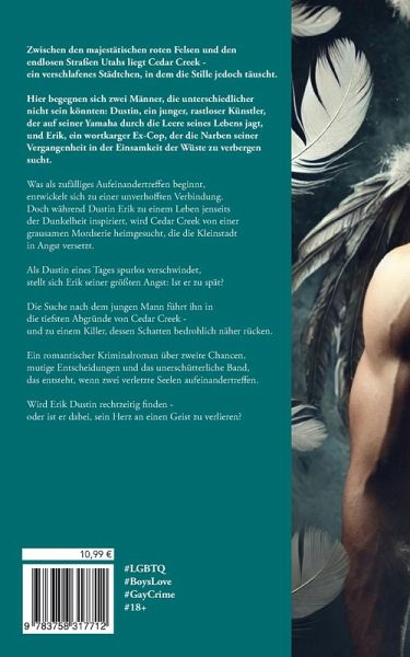 Zwischen den majestätischen roten Felsen und den endlosen Straßen Utahs liegt Cedar Creek - ein verschlafenes Städtchen, in dem die Stille jedoch täuscht. Hier begegnen sich zwei Männer, die unterschiedlicher nicht sein könnten: Dustin, ein junger, rastloser Künstler, der auf seiner Harley durch die Leere seines Lebens jagt, und Erik, ein wortkarger Ex-Cop, der die Narben seiner Vergangenheit in der Einsamkeit der Wüste zu verbergen sucht. Was als zufälliges Aufeinandertreffen beginnt, entwickelt sich zu einer unverhofften Verbindung. Doch während Dustin Erik zu einem Leben jenseits der Dunkelheit inspiriert, wird Cedar Creek von einer grausamen Mordserie heimgesucht, die die Kleinstadt in Angst versetzt. Als Dustin eines Tages spurlos verschwindet, stellt sich Erik seiner größten Angst: Ist er zu spät? Die Suche nach dem jungen Mann führt ihn in die tiefsten Abgründe von Cedar Creek - und zu einem Killer, dessen Schatten bedrohlich näher rücken. Ein romantischer Kriminalroman über zweite Chancen, mutige Entscheidungen und das unerschütterliche Band, das entsteht, wenn zwei verletzte Seelen aufeinandertreffen. Wird Erik Dustin rechtzeitig finden - oder ist er dabei, sein Herz an einen Geist zu verlieren?