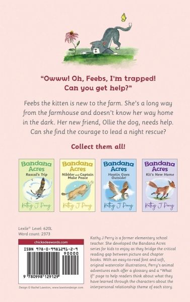 Can a kitten help a dog in trouble? She can if she has compassion and courage! Even though she's new to the farm, Feebs' willingness to help Ollie outweighs her fear of being in a new place, alone, and at night. She leads a rescue after a storm causes a branch to break, fall, and pin poor Ollie to the ground. She's awarded an awesome red "bandana" which shows she's part of the bandana buddies - a club created by Maddie for the animals as they learn important lessons or show valuable friendship qualities. Feebs is introduced to a new friend the next day: a barn owl.