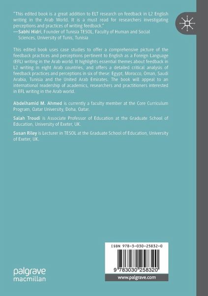 Chapter I: Feedback in EFL Writing: Arab World Contexts, Issues and Challenges (Abdelhamid Ahmed).- Part I: Perceptions about Feedback in L2 English Writing.- Chapter II: Students' Perceptions About Teachers' Written Feedback on Writing in a Moroccan University Context (Meriem Ouahidi and Fouzia Lamkhanter).- Chapter III: Students' Perceptions of 4D Feedback Treatment on EFL Writing in Oman (Nazanin Dehdary and Hashil Al-Saadi).- Chapter IV: Harnessing the Power of Feedback to Assist Progress: A Process-based Approach of Providing Feedback to L2 Composition Students in the United Arab Emirates (Sana Sayed and Brad Curabba).- Part II: Feedback Practices in L2 English Writing.- Chapter V: The Effect of EFL Correction Practices on Developing Moroccan Students' English Writing Skills (Hicham Zyad and Abdelmajid Bouziane).- Chapter VI: Feedback Practices in University English Writing Classes in Tunisia: An Exploratory Study (Moez Athimni).- ChapterVII: Supervisors' Written Feedback on Saudi Postgraduate Students' Problems with Academic English Writing in Selected UK Universities (Noof Al-Harbi and Salah Troudi).- Chapter VIII: Teachers' Feedback on EFL Students' Dissertation Writing in Morocco (Mohammed Larouz and Soufiane Abouabdelkader).- Chapter IX: Conclusion and Final Remarks (Salah Troudi and Susan Riley).