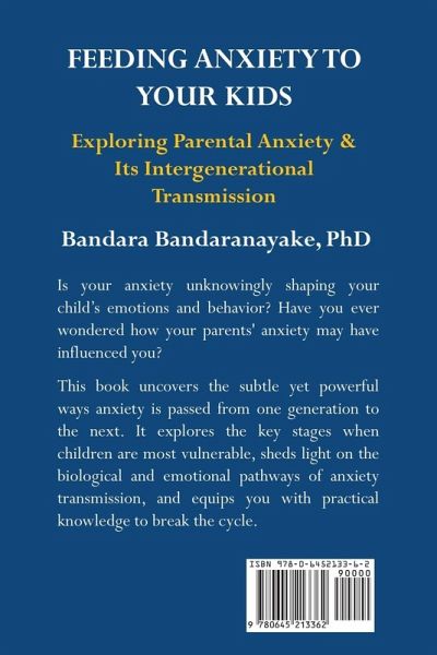 Are you unknowingly passing your anxiety to your children? Have you ever wondered how your parents' anxiety may have influenced you? Discover the hidden ways anxiety is transmitted across generations. Uncover the critical times and stages when children are most vulnerable. Discover your innate mind power and explore deliberate strategies to break free from the cycle of anxiety. Feeding Anxiety to Your Kids uncovers the often-overlooked phenomenon of how parental anxiety is transmitted to children, profoundly shaping their emotional and psychological development. Drawing from extensive clinical experience with adolescents struggling with severe anxiety, panic attacks, and self-harming behaviors, this book reveals how parental anxiety can subtly but significantly influence children's well-being and affect family dynamics across generations.This publication offers a well-rounded understanding andmultifaceted nature of anxiety. By integrating cutting-edge research in evolutionary psychology, neurobiology, and psychodynamics with real-life examples from clinical practice, the book provides readers with deep insights into the origins of parental anxiety and its far-reaching consequences. It highlights critical life stages-pregnancy, early childhood, and adolescence-when children are particularly vulnerable to absorbing anxiety. The book examines how dysregulated behaviors like overprotection, hypervigilance, catastrophic thinking, emotional unavailability, and inconsistent parenting unintentionally perpetuate anxiety, while also exploring the broader intergenerational and multigenerational impacts.Feeding Anxiety to Your Kids offers a hopeful and proactive approach, emphasising that effective strategies and tools are available to break the cycle of anxiety. It serves as a call to deliberate action for parents, caregivers, therapists, and health professionals, providing practical strategies, actionable insights, and encouragement to nurture emotionally secure and resilient families. Whether you are a parent navigating personal challenges, a professional supporting family, or an individual seeking to understand anxiety's complexities, this book delivers a comprehensive blend of knowledge and optimism for fostering a healthier, brighter future for generations to come.