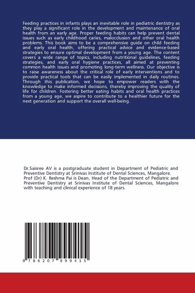 Feeding practices in infants plays an inevitable role in pediatric dentistry as they play a significant role in the development and maintenance of oral health from an early age. Proper feeding habits can help prevent dental issues such as early childhood caries, malocclusion and other oral health problems. This book aims to be a comprehensive guide on child feeding and early oral health, offering practical advice and evidence-based strategies to ensure optimal development from a young age. The content covers a wide range of topics, including nutritional guidelines, feeding strategies, and early oral hygiene practices, all aimed at preventing common health issues and promoting long-term wellness. Our objective is to raise awareness about the critical role of early interventions and to provide practical tools that can be easily implemented in daily routines. Through this publication, we hope to empower readers with the knowledge to make informed decisions, thereby improving the quality of life for children. Fostering better eating habits and oral health practices from a young age, we aspire to contribute to a healthier future for the next generation and support the overall well-being.
