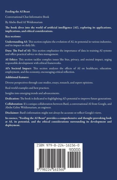 Feeding the AI Beast Conversational Chat Informative Book By Abebe-Bard AI Woldemariam The book dives into the world of artificial intelligence (AI), exploring its applications, implications, and ethical considerations. Key sections: Understanding AI: This section explains the evolution of AI, its potential in various industries, and its impact on daily life. Data: The Fuel of AI: This section emphasizes the importance of data in training AI systems and offers practical advice on data management. AI Ethics: This section tackles complex issues like bias, privacy, and societal impact, urging responsible development with ethical frameworks. AI's Societal Impact: This section analyzes the effects of AI on healthcare, education, employment, and the economy, encouraging critical reflection. Additional features: Diverse perspectives through case studies, essays, research, and expert opinions. Real-world examples and best practices. Insights into emerging trends and advancements. Dedication: The book is dedicated to highlighting AI's potential to improve future generations. Collaboration: It's a unique collaboration between Bard, a conversational AI from Google, and Abebe Gebre Woldemariam, an engineer. Disclaimer: Bard's information might not always be accurate or reflect Google's views. In essence, "Feeding the AI Beast" provides a comprehensive and thought-provoking look at AI, its potential, and the ethical considerations surrounding its development and deployment.