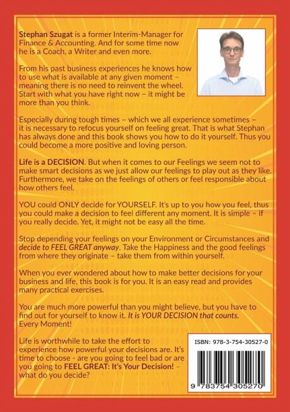Discover the power within yourself to make better decisions and live a more fulfilling life with Stephan Szugat's book. As a former Interim-Manager for Finance & Accounting, Stephan knows the value of utilizing what you already have instead of constantly searching for something new. This book will guide you in refocusing your mindset, especially during tough times, and help you become a more positive and loving person. With practical exercises and an easy-to-read format, you'll learn how to take control of your feelings and make smart decisions for both your business and personal life.Are you tired of allowing your feelings to dictate your happiness? It's time to take charge and make a decision to feel great, regardless of your environment or circumstances. This book will show you how to break free from the cycle of depending on external factors for your emotions. By understanding that you have the power to choose how you feel, you can make a conscious decision to feel different at any moment. While it may not always be easy, this book provides the tools and guidance you need to start experiencing the joy and positivity that come from within yourself.Unleash the true potential of your decisions with this empowering book. Whether you're seeking personal growth or looking to improve your business strategies, this book offers valuable insights and practical exercises to help you make better choices. By realizing that every moment is an opportunity to decide how you feel, you can break free from the limitations imposed by external circumstances. Take the leap and discover the immense power you hold within yourself. It's time to decide - will you let negativity rule your life, or will you make the decision to FEEL GREAT? The choice is yours.