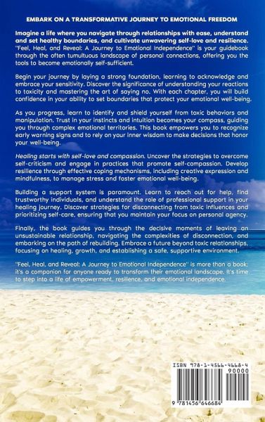 Embark on a Transformative Journey to Emotional Freedom Imagine a life where you navigate through relationships with ease, understand and set healthy boundaries, and cultivate unwavering self-love and resilience. "Feel, Heal, and Reveal: A Journey to Emotional Independence" is your guidebook through the often tumultuous landscape of personal connections, offering you the tools to become emotionally self-sufficient. Begin your journey by laying a strong foundation, learning to acknowledge and embrace your sensitivity. Discover the significance of understanding your reactions to toxicity and mastering the art of saying no. With each chapter, you will build confidence in your ability to set boundaries that protect your emotional well-being. As you progress, learn to identify and shield yourself from toxic behaviors and manipulation. Trust in your instincts and intuition becomes your compass, guiding you through complex emotional territories. This book empowers you to recognize early warning signs and to rely on your inner wisdom to make decisions that honor your well-being. Healing starts with self-love and compassion. Uncover the strategies to overcome self-criticism and engage in practices that promote self-compassion. Develop resilience through effective coping mechanisms, including creative expression and mindfulness, to manage stress and foster emotional well-being. Building a support system is paramount. Learn to reach out for help, find trustworthy individuals, and understand the role of professional support in your healing journey. Discover strategies for disconnecting from toxic influences and prioritizing self-care, ensuring that you maintain your focus on personal agency. Finally, the book guides you through the decisive moments of leaving an unsustainable relationship, navigating the complexities of disconnection, and embarking on the path of rebuilding. Embrace a future beyond toxic relationships, focusing on healing, growth, and establishing a safe, supportive environment. "Feel, Heal, and Reveal: A Journey to Emotional Independence" is more than a book; it's a companion for anyone ready to transform their emotional landscape. It's time to step into a life of empowerment, resilience, and emotional independence.