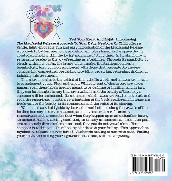 Feel Your Heart and Light: Introducing The Myofascial Release Approach To Your Baby, Newborn Or Child offers a gentle, light, enjoyable, fun and easy introduction of The Myofascial Release Approach to babies, newborns and children to be shared in the space that is created and held within the loving moments of story time. In its simplicity, it returns its reader to the joy of reading as a beginner. Through its simplicity, it blends within its pages, the layers of its images, illustrations, concepts, terminology, text, symbols and script with those that resonate for anyone considering, connecting, preparing, providing, receiving, returning, finding, or finishing this treatment. There are no rules to the telling of his tale. Its words and images are meant to complement yours. Play; and enjoy. While its cast of characters are given names, even these labels are not meant to be defining or limiting; and, in fact, they can be changed to any that are available, and the beauty of the story's outcome will be unchanged. Its sequence, which pages are read or not read, and even the experience, position or orientation of the book, reader and listener are irrelevant to the beauty in its connection and the value of its sharing. When used as a field guide by its reader and listener along the travels of their healing journey, it serves as a companion, a resource, a reference, a reassurance and a reminder that when they happen upon an unfamiliar beast, an uncomfortable traveling condition, an uneasy uneasiness, an uncertain path or a seemingly directionless crossroad, that you do not travel alone. Your compass is within you. Your healing blends with your feeling. This approach to myofascial release is never forced. Authentic healing comes with ease. Feeling your heart and feeling your light connect as one, with everything.