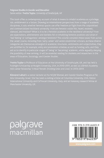 Chapter 1. Introduction; Yvette Taylor & Kinneret Lahad.- Chapter 2. Failure to Launch? Feminist Endeavours as a Partial Academic; Heather Shipley.- Chapter 3. Feminist Conference Time: Aiming (not) to have Been There; Emily F. Henderson.- Chapter 4. Navigating the Emotional Landscapes of Academia: Queer Encounters; Yvette Taylor.- Chapter 5. Performing 'Foreign Talentness' in a Chinese University: An Auto-ethnographical Account; Lauren Ila Misiaszek.- Chapter 6. Writing Yourself In? The Price of Playing the (Feminist) Game in Academia; Sarah Burton.- Chapter 7. Work and Neoliberal-corporatist University; Laura Lovin.- Chapter 8. Feel the Fear and 'Feminist' Anyway: Being a Challenging Presence in the Neoliberal University; Órla Meadhbh.- Chapter 9. Feeling Ambivalent in Early Career Academia: Auto-ethnographic Tales of 'Success' and 'Failure'; Maddie Breeze.- Chapter 10. Gender and Waiting in Everyday Academic Life; Barbara Read & Lisa Bradley.- Chapter 11. A Long Goodbye to the 'GoodGirl': An Auto-ethnographic Account; Pat Thomson.- Chapter 12. Being and Becoming Academic: A Collaborative Exploration of Academic Identities; Susanne Gannon, Karin MacKay, Sarah Powell & Clare Power.- Chapter 13. Crying on Campus; Daphna Hacker.- Chapter 14. When Love Becomes Self-abuse: Gendered Perspectives on Unpaid Labor in Academia; Francesca Coin.- Chapter 15. Teaching Gender in a Postfeminist Management classroom; Nick Rumens.- Chapter 16. Digital Scholars: A Feeling for the Academic Game; Cristina Costa.