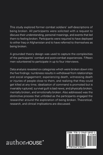 This study explored former combat soldiers’ self-descriptions of being broken. All participants were solicited with a request to discuss their understanding, personal meanings, and events that led them to feeling broken. Participants were required to have deployed to either Iraq or Afghanistan and to have referred to themselves as being broken. A grounded theory design was used to capture the complexities of the participants’ combat and post-combat experiences. Fifteen men volunteered to participate in up to four interviews. Data analysis revealed six categories which were broken down into the five findings: numbness results in withdrawal from relationships and social engagement; experiencing death, witnessing death or injuries of people close to them, and realizing that they could get killed at any time; idealization of command is promoted but is invariably ruptured; survival guilt is bad news; and physically broken, mentally broken, and emotionally broken. Also addressed was the distinctive process that unfolded as the participants engaged the researcher around the exploration of being broken. Theoretical, research, and clinical implications are discussed.