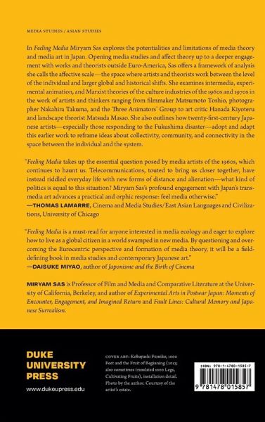 In Feeling Media Miryam Sas explores the potentialities and limitations of media theory and media art in Japan. Opening media studies and affect theory up to a deeper engagement with works and theorists outside Euro-America, Sas offers a framework of analysis she calls the affective scale-the space where artists and theorists work between the level of the individual and larger global and historical shifts. She examines intermedia, experimental animation, and Marxist theories of the culture industries of the 1960s and 1970s in the work of artists and thinkers ranging from filmmaker Matsumoto Toshio, photographer Nakahira Takuma, and the Three Animators' Group to art critic Hanada Kiyoteru and landscape theorist Matsuda Masao. She also outlines how twenty-first-century Japanese artists-especially those responding to the Fukushima disaster-adopt and adapt this earlier work to reframe ideas about collectivity, community, and connectivity in the space between the individual and the system.