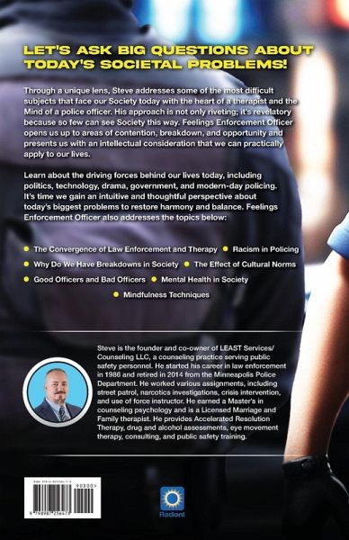 Through a unique lens, Steve addresses some of the most difficult subjects that face our society today with the heart of a therapist and the Mind of a police officer. His approach is not only riveting; it's revelatory because so few are able to see Society this way. Feelings Enforcement Officer opens us up to areas of contention, breakdown, and opportunity and presents us with an intellectual consideration that we can practically apply to our own lives. Learn about the driving forces behind our lives today, including politics, technology, drama, our government, and modern-day policing. It's time that we gain an intuitive and thoughtful perspective about today's biggest problems to bring harmony and balance back. Feelings Enforcement Officer also addresses the topics below: The convergence of law enforcement and therapy Why do we have breakdowns in society Racism in policing The effect of cultural norms Good officers and bad officers Mental Health in Society Mindfulness techniques