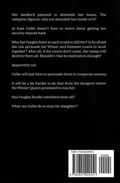 Her landlord planned to demolish her house. The vampires figured, why not demolish her inside of it? At least Callie doesn't have to worry about getting her security deposit back. Why has Vaughn been in such a rush to kill her? Is he afraid she can persuade the Winter and Summer courts to work together? After all, if the courts don't unite, the vamps will destroy them all. Shouldn't that be motivation enough? Apparently not. Callie will just have to persuade them to cooperate anyway. It will be a bit harder to do that from the dungeon where the Winter Queen promised to toss her. Has Vaughn finally outwitted them all? What can Callie do to stop the slaughter? Go Up and click Read For Free or Buy Now and find out if Vaughn is as smart as he thinks he is.
