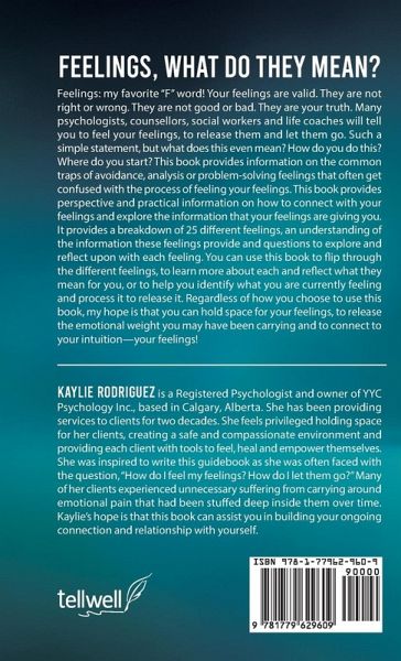 Feelings: my favorite "F" word! Your feelings are valid. They are not right or wrong. They are not good or bad. They are your truth. Many psychologists, counsellors, social workers and life coaches will tell you to feel your feelings, to release them and let them go. Such a simple statement, but what does this even mean? How do you do this? Where do you start? This book provides information on the common traps of avoidance, analysis, or problem-solving feelings that often get confused with the process of feeling your feelings. This book provides perspective and practical information on how to connect with your feelings and explore the information that your feelings are giving you. It provides a breakdown of 25 different feelings, an understanding of the information these feelings provide and questions to explore and reflect upon with each feeling. You can use this book to flip through the different feelings, to learn more about each and reflect what they mean for you, or to help you identify what you are currently feeling and process it to release it. Regardless of how you choose to use this book, my hope is that you can hold space for your feelings, to release the emotional weight you may have been carrying and to connect to your intuition-your feelings