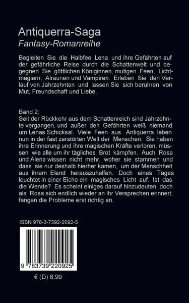 Die Fantasy-Romanreihe ANTIQUERRA-SAGA: Begleiten Sie die Halbfee Lena und ihre Gefährten auf der gefährlichen Reise durch die Schattenwelt und begegnen Sie göttlichen Königinnen, mutigen Feen, Lichtmagiern, Alraunen und Vampiren. Erleben Sie den Verlauf von Jahrzehnten und lassen Sie sich berühren von Mut, Freundschaft und Liebe.Band 2Seit der Rückkehr aus dem Schattenreich sind Jahrzehnte vergangen, und außer den Gefährten weiß niemand um Lenas Schicksal. Viele Feen aus Antiquerra leben nun in der fast zerstörten Welt der Menschen. Sie haben ihre Erinnerung und ihre magischen Kräfte verloren, müssen wie alle um ihr tägliches Brot kämpfen. Auch Rosa und Alena wissen nicht mehr, woher sie stammen und dass sie nur deshalb hierher kamen, um der Menschheit aus ihrem Elend herauszuhelfen. Doch eines Tages leuchtet in einer Eiche ein magisches Licht auf. Ist das die Wende? Es scheint einiges darauf hinzudeuten, doch als Rosa sich endlich wieder an ihr Versprechen erinnert, fangen die Probleme erst richtig an.