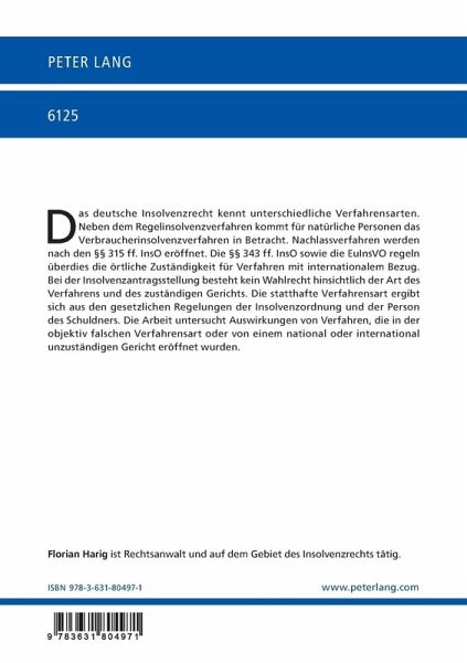Das deutsche Insolvenzrecht kennt unterschiedliche Verfahrensarten. Neben dem Regelinsolvenzverfahren kommt für natürliche Personen das Verbraucherinsolvenzverfahren in Betracht. Nachlassverfahren werden nach den §§ 315 ff. InsO eröffnet. Die §§ 343 ff. InsO sowie die EuInsVO regeln überdies die örtliche Zuständigkeit für Verfahren mit internationalem Bezug. Bei der Insolvenzantragsstellung besteht kein Wahlrecht hinsichtlich der Art des Verfahrens und des zuständigen Gerichts. Die statthafte Verfahrensart ergibt sich aus den gesetzlichen Regelungen der Insolvenzordnung und der Person des Schuldners. Die Arbeit untersucht Auswirkungen von Verfahren, die in der objektiv falschen Verfahrensart oder von einem national oder international unzuständigen Gericht eröffnet wurden.
