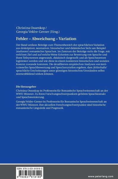 Der Band umfasst Beiträge zum Themenbereich der sprachlichen Variation aus deskriptiver, normativer, historischer und didaktischer Sicht am Beispiel (mehrerer) romanischer Sprachen. Im Zentrum der Beiträge steht die Frage, mit welchem Ziel und auf welche Weise Kriterien zur Bewertung von Sprache und ihren Teilsystemen angewandt, didaktisch dargestellt und als Sprachnormen legitimiert werden und wie diese in einem konkreten historischen und sozialen Kontext zustande kommen. Die detaillierten empirischen Analysen von institutioneller Sprachbewertung und Sprecherurteilen ergeben, dass 'fehlerhafte' sprachliche Erscheinungen unter günstigen historischen Umständen selbst normenbildend wirken können.