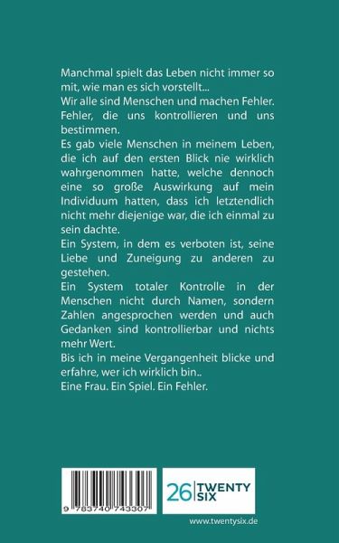 Manchmal spielt das Leben nicht immer so mit, wie man es sich vorstellt ...Wir alle sind Menschen und machen Fehler. Fehler, die uns kontrollieren und uns bestimmen. Aber wieso? Ist es nicht das, was uns menschlich macht?Die Menschen unserer Umgebung haben Auswirkungen auf unser Individuum, sodass wir plötzlich nicht mehr diejenigen sind, die wir einmal zu sein dachten.Ein System, das Realität und Wahrheit hinterfragt. Denn die größte Macht dieser Welt, wird sich wohl kaum im Reichtum oder der Kraft widerspiegeln, sondern vielmehr im Wissen der Worte selbst. Wir können nicht mehr wissen, als unser Verstand zulässt. Ein System totaler Kontrolle, in der Menschen nicht durch Namen, sondern Zahlen angesprochen werden, und auch Gedanken sind kontrollierbar und nichts mehr Wert. Was bleibt dann noch?Bis ich in meine Vergangenheit blicke und erfahre, wer ich wirklich bin.Eine Frau. Ein Spiel. Ein Fehler.