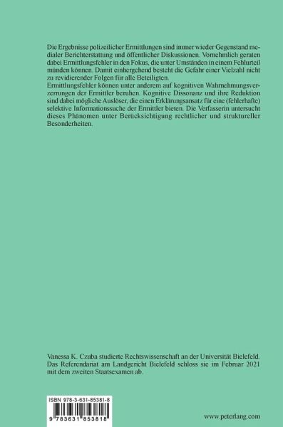 Die Ergebnisse polizeilicher Ermittlungen sind immer wieder Gegenstand medialer Berichterstattung und öffentlicher Diskussionen. Vornehmlich geraten dabei Ermittlungsfehler in den Fokus, die unter Umständen in einem Fehlurteil münden können. Damit einhergehend besteht die Gefahr einer Vielzahl nicht zu revidierender Folgen für alle Beteiligten. Ermittlungsfehler können unter anderem auf kognitiven Wahrnehmungsverzerrungen der Ermittler beruhen. Kognitive Dissonanz und ihre Reduktion sind dabei mögliche Auslöser, die einen Erklärungsansatz für eine (fehlerhafte) selektive Informationssuche der Ermittler bieten. Die Verfasserin untersucht dieses Phänomen unter Berücksichtigung rechtlicher und struktureller Besonderheiten.