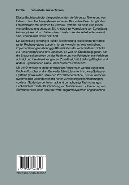 Dieses Buch beschreibt die grundlegenden Verfahren zur Tolerierung von Fehlern, die in Rechensystemen auftreten. Besondere Beachtung finden Fehlertoleranz-Maßnahmen für verteilte Systeme, da diese eine zunehmende Bedeutung erlangen. Die Ansätze zur Vermeidung von Zuverlässigkeitsengpässen durch Fehlertoleranz-Instanzen, die selbst fehlertolerant sind, werden ausführlich diskutiert. Die Darstellung ist weniger auf die Beschreibung existierender fehlertoleranter Rechensysteme ausgerichtet als vielmehr auf eine systematische, weitgehend implementierungsunabhängige Klassifikation der verschiedenen Schritte zur Fehlertoleranz und ihrer Varianten. Es wird ein Überblick gegeben, der die Entwurfsalternativen bei der Realisierung von Fehlertoleranz-Verfahren aufzeigt und ihre Auswirkungen auf Zuverlässigkeit, Leistungsfähigkeit und andere Eigenschaften eines Rechensystems verdeutlicht.