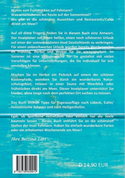 Wohin zum Frühstücken auf Fehmarn? Was unternehmen wir heute auf der Sonneninsel? Wo gibt es die schönsten Aussichten und Restaurants/Cafés direkt am Meer? Auf all diese Fragen, finden Sie in diesem Buch eine Antwort. Der Inselplaner soll Ihnen helfen, einen noch schöneren Urlaub auf einer der sonnenreichsten Insel Deutschlands zu verbringen. Für einen unbeschwerten Urlauben wurden bereits Wochenenden im Frühling, Herbst und Winter für Sie vorausgeplant. Im Sommer ist eine Urlaubswoche für Sie gestaltet mit vielen Vorschlägen für Unternehmungen, die Sie individuell für sich umstellen können.Machen Sie im Herbst ein Picknick auf einem der schönen Küstenpfade, wandern Sie durch ein wunderbares Naturschutzgebiet, relaxen in einer Sauna mit Meerblick oder frühstücken Sie direkt am Meer. Dieser Inselplaner unterstützt Sie hierbei, ohne lange nach dem perfekten Ort suchen zu müssen.Das Buch enthält Tipps für Tagesausflüge nach Lübeck, Eutin/Holsteinische Schweiz und Heiligenhafen.Egal,ob sportliche Aktivitäten oder einfach nur die Seele baumeln lassen - dieses Buch entführt Sie an die schönsten Stellen der Insel Fehmarn. Haben Sie einfach wunderbare Ferien oder ein erholsames Wochenende am Meer!Ihre Bettina Latt