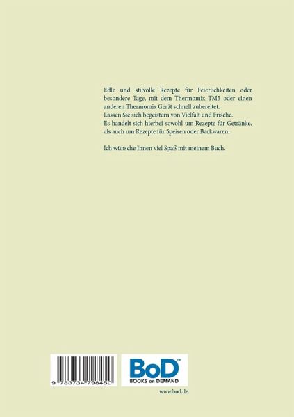 Edle und stilvolle Rezepte für Feierlichkeiten oder besondere Tage, mit dem Thermomix TM5 oder einen anderen Thermomix Gerät schnell zubereitet.Lassen Sie sich begeistern von Vielfalt und Frische.Es handelt sich hierbei sowohl um Rezepte für Getränke, als auch um Rezepte für Speisen oder Backwaren.Ich wünsche Ihnen viel Spaß mit meinem Buch.