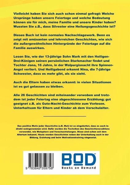 Dieses Buch zeigt in Form von Geschichten die außergewöhnlichen Hintergründe unserer Feiertage und wie sie auch heute noch motivierend auf das Familienleben wirken, z.B. um Alltagssituationen mit Kindern zu meistern oder einfach mehr Spaß zu haben. Jeder Feiertag ist eine abgeschlossene Erzählung und ist auch zum Vorlesen geeignet.