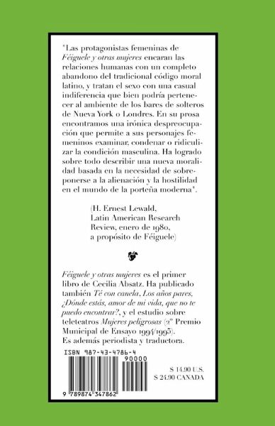 The female protagonists of Féiguele and other women face human relationships with a complete abandonment of the traditional Latin moral code, and treat sex with a casual indifference that could well belong to the environment of the singles bars in New York or London. In her prose we find an ironic nonchalance that allows her female characters to examine, condemn or ridicule the male condition. Above all, he has managed to describe a new morality based on the need to overcome alienation and hostility in the world of modern Buenos Aires ". (H. Ernest Lewald, -Latin American Research Review, January 1980, - about Féiguele ) Féiguele and other women is the first book by Cecilia Absatz.