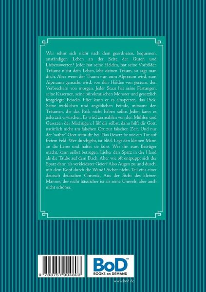 Wer sehnt sich nicht nach dem geordneten, bequemen, anständigen Leben an der Seite der Guten und Liebenswerten? Jeder hat seine Helden, hat seine Vorbilder. Träume nicht dein Leben, lebe deinen Traum, so sagt man doch. Aber wenn der Traum nun zum Alptraum wird, zum Alptraum gemacht wird, von den Helden von gestern, den Verbrechern von morgen. Jeder Staat hat seine Festungen, seine Kasernen, seine bürokratischen Monster und gesetzlich festgelegte Fesseln. Hier kann er es einsperren, das Pack. Seine wirklichen und angeblichen Feinde, mitsamt den Träumen, die das Pack nicht haben sollte. Jeden kann es jederzeit erwischen. Es wird zermahlen von den Mühlen und Gesetzen der Mächtigen. Hilf dir selbst, dann hilft dir Gott, natürlich nicht am falschen Ort zur falschen Zeit. Und nur der "wahre" Gott steht dir bei. Das Gesetz ist wie ein Tor auf freiem Feld. Wer durchgeht, ist blöd. Legt den kleinen Mann an die Leine und haltet sie kurz. Wer ihn zum Betrüger macht, kann selbst betrügen. Lieber den Spatz in der Hand als die Taube auf dem Dach. Aber wie oft entpuppt sich der Spatz dann als verkleideter Geier? Also Augen zu und durch, mit dem Kopf durch die Wand? Sicher nicht. Teil eins einer deutsch deutschen Chronik. Aus der Sicht des kleinen Mannes, der nicht hässlicher ist als seine Umwelt, aber auch nicht schöner.