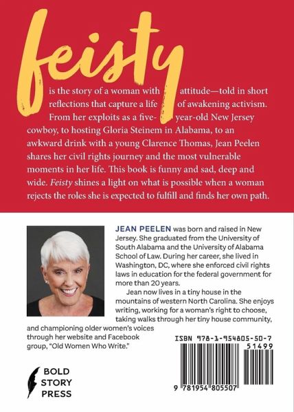 Feisty is the story of a woman with attitude-told in short reflections that capture a life of awakening activism. From her exploits as a five-year-old New Jersey cowboy, to hosting Gloria Steinem in Alabama, to an awkward drink with a young Clarence Thomas, Jean Peelen shares her civil rights journey and the most vulnerable moments in her life. This book is funny and sad, deep and wide. Feisty shines a light on what is possible when a woman rejects the roles she is expected to fulfill and finds her own path.
