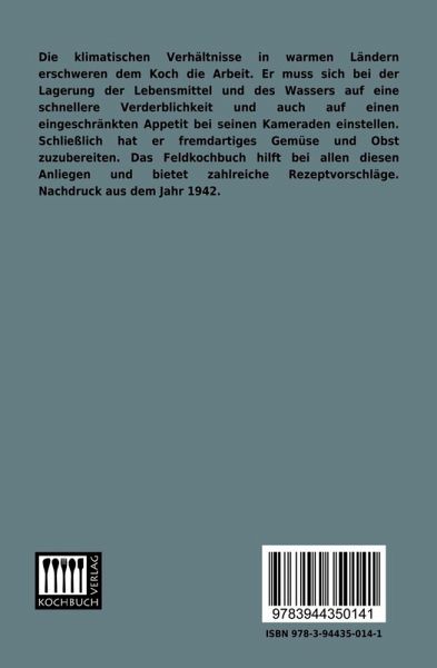 Die klimatischen Verhältnisse in warmen Ländern erschweren dem Koch die Arbeit. Er muss sich bei der Lagerung der Lebensmittel und des Wassers auf eine schnellere Verderblichkeit und auch auf einen eingeschränkten Appetit bei seinen Kameraden einstellen. Schließlich hat er fremdartiges Gemüse und Obst zuzubereiten. Das Feldkochbuch hilft bei allen diesen Anliegen und bietet zahlreiche Rezeptvorschläge. Nachdruck aus dem Jahr 1942.