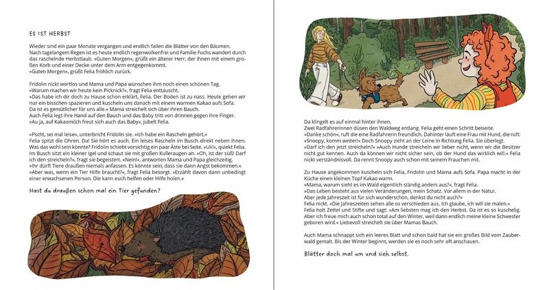 Teil 3 der Felia Fuchs - Buchreihe aus dem Räuberfuchs mit realistischen Geschichten aus dem Kinderalltag Felia Fuchs ist 4 Jahre alt und liebt ihr buntes Ringelshirt sowie ihr rotes Latzhosenkleid. Zusammen mit ihrem Kuschelerdmännchen Manni, Mama, Papa und Bruder Fridolin erlebt Felia im Fuchsbau alltägliche Situationen, Emotionen und Übergänge. Im dritten Band der Reihe "Draußen unterwegs" finden sich drei Geschichten: 1. Der Zauberwald: Felia besucht mit Familie und Freunde den Wald - über vier Jahreszeiten hinweckt streckt sich diese Geschichte, in der der Bauch von Felias Mama immer größer wird und Felia große Schwester wird. Eine zauberhafte Geschichte über Veränderungen. 2. Die müden Füße: Oma und Opa sind zu Besuch. Aber Felia Füße sind SO müde und wollen nicht laufen. Zum Glück hat Opa eine lustige Idee. 3. Marktplatz: Die Kita Kunterbunt macht einen Ausflug zum Marktplatz. Dort dürfen die Kinder sich etwas kaufen. Mit einer empathischen Wendung voller Mitgefühl. In allen Geschichten dürfen natürlich der Umgang mit Gefühlen, Regeln des Miteinanders sowie Verkehrsregeln nicht fehlen.