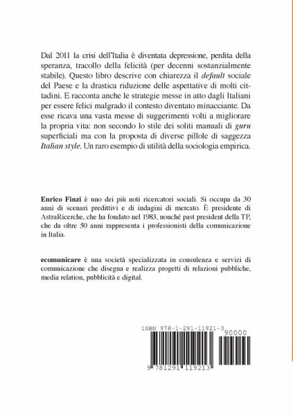 Dal 2011 la crisi dell'Italia è diventata depressione, perdita della speranza, tracollo della felicità (per decenni sostanzialmente stabile). Questo libro descrive con chiarezza il default sociale del Paese e la drastica riduzione delle aspettative di molti cittadini. E racconta anche le strategie messe in atto dagli Italiani per essere felici malgrado il contesto diventato minacciante. Da esse ricava una vasta messe di suggerimenti volti a migliorare la propria vita: non secondo lo stile dei soliti manuali di guru superficiali ma con la proposta di diverse pillole di saggezza Italian style. Un raro esempio di utilità della sociologia empirica. Enrico Finzi è uno dei più noti ricercatori sociali. Si occupa da 30 anni di scenari predittivi e di indagini di mercato. E' presidente di AstraRicerche, che ha fondato nel 1983, nonché past president della TP, che da oltre 50 anni rappresenta i professionisti della comunicazione in Italia.