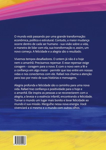 O mundo está passando por uma grande transformação - econômica, política e estrutural. Contudo, a maior mudança ocorre dentro de cada ser humano - sua visão sobre a vida, a maneira de lidar com ela, sua transformação e, assim, um novo começo. A felicidade e a alegria são o resultado. Vivemos tempos desafiadores. O ontem já não é o hoje nem o amanhã. Precisamos repensar. E esse repensar exige coragem - coragem para o novo. E com o novo vem a fé e a confiança em algo maior - permitir que isso entre em nossas vidas e nos conectemos com ele. Rafael nos chama a atenção para isso por meio de suas histórias e mensagens. Alegria profunda e felicidade são o caminho para uma nova vida. Rafael traz confiança e positividade para o hoje e o amanhã. Ele inspira as pessoas a se reconectarem com a alegria, a leveza e a essência infantil, encontrando a felicidade. Tornar o mundo um lugar mais bonito e levar felicidade ao mundo é sua missão. Mergulhe nessa nova energia. Você vivenciará a si mesmo e o mundo com outros olhos.