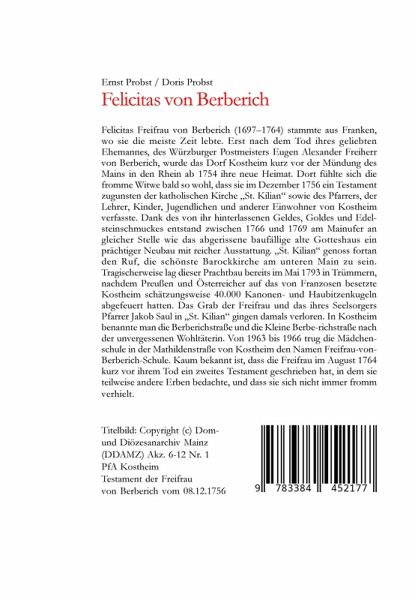 Felicitas Freifrau von Berberich (1697-1764) stammte aus Franken, wo sie die meiste Zeit lebte. Erst nach dem Tod ihres geliebten Ehemannes, des Würzburger Postmeisters Eugen Alexander Freiherr von Berberich, wurde das Dorf Kostheim kurz vor der Mündung des Mains in den Rhein ab 1754 ihre neue Heimat. Dort fühlte sich die fromme Witwe bald so wohl, dass sie im Dezember 1756 ein Testament zugunsten der katholischen Kirche "St. Kilian" sowie des Pfarrers, der Lehrer, Kinder, Jugendlichen und anderer Einwohner von Kostheim verfasste. Dank des von ihr hinterlassenen Geldes, Goldes und Edelsteinschmuckes entstand zwischen 1766 und 1769 am Mainufer an gleicher Stelle wie das abgerissene baufällige alte Gotteshaus ein prächtiger Neubau mit reicher Ausstattung. "St. Kilian" genoss fortan den Ruf, die schönste Barockkirche am unteren Main zu sein. Tragischerweise lag dieser Prachtbau bereits im Mai 1793 in Trümmern, nachdem Preußen und Österreicher auf das von Franzosen besetzte Kostheim schätzungsweise 40.000 Kanonen- und Haubitzenkugeln abgefeuert hatten. Das Grab der Freifrau und das ihres Seelsorgers Pfarrer Jakob Saul in "St. Kilian" gingen damals verloren. In Kostheim benannte man die Berberichstraße und die Kleine Berberichstraße nach der unvergessenen Wohltäterin. Von 1963 bis 1966 trug die Mädchenschule in der Mathildenstraße von Kostheim den Namen Freifrau-von-Berberich-Schule. Kaum bekannt ist, dass die Freifrau im August 1764 kurz vor ihrem Tod ein zweites Testament geschrieben hat, in dem sie teilweise andere Erben bedachte, und dass sie sich nicht immer fromm verhielt.