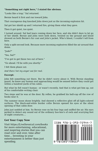"Something not right here," I stated the obvious. "Looks like a trap," Sal returned. Bernie heard it first and ran toward John. That courageous dog knocked John down just as the incoming explosion hit. Sal got her shield up and I returned fire, giving them what they gave. Then it got quiet, too quiet. I turned around. Sal had tears coming down her face, and she didn't dare to let go of her shield. Bernie and John were both down, twisted on the ground and blood showed on both Bernie's fur coat and John's jacket. Who's blood, I couldn't tell from here. Only a split-second look. Because more incoming explosives filled the air around that dome. "Jude?" "Yes, Sal?" "I've got to get these two out of here." "Go ahead. I'll be with you shortly." I felt them phase out. And then I let my anger out for real. Excerpt: John felt something out there. But he didn't worry about it. With Bernie standing guard, he knew any human soul approaching would be sensed before they could get within a hundred yards of his cabin. But what he felt wasn't human - or wasn't recently. And that is what got him up, out of his comfortable writing chair. Two steps and he was at the door. By reflex, he grabbed his ball-cap off the row of hooks near it. The summer moon shone brightly. And showed a reflective glint off all light-colored surfaces. The black-and-white border collie Bernie opened his eyes at the silent opening of that cabin door. John just nodded at him. So Bernie rose on his four legs and sniffed the air. His ears perked to detect any sound out of the ordinary hoo-hoo's of owls and scurrying feet of night creatures. "What do you sense, Bernie?" John's thoughts sent clearly to the dog, a talent he'd been refining with someone nearby who could help him master it. "Nothing. What did you feel?" The black-white collie still was at alert, all senses tracking anything out of the ordinary. "A once-human. Someone I've met before." John looked first down the overgrown driveway and then to the cow-path trail some visitors liked to frequent. Bernie started, pointing his hears and eyes down that path. Then he relaxed, and smiled as he began panting. "Yes, they seem familiar. Not that we've met, but they know you." John relaxed, and came over to Bernie to scratch his back. And wait. Soon the moonlight showed two female forms coming down that wide cow-path. One tall and dark, the other shorter and dressed in a white, long gown. It would be some time before they got into enough light to make out their faces. The girl in white was being supported by the taller woman, as she having some difficulty walking. It wasn't Jude or Sal, thought John, as I'd recognize them by now - and they most often just shifted right inside the cabin or to the porch outside. Walking anywhere wasn't normal for them. This mystery pair stopped for a moment, as the smaller woman dressed in white seemed to crumple slightly. The tall woman bent to support her for the minute she needed, then they both straightened and continued toward us. John thought to turn on the porch light, but reconsidered. This nearly-full summer moon was more than enough, and the porch light would make everyone's eyesight limited if they did. Those two women were having enough trouble walking as it was, without having to peer at the path in front of them against the glare of the porch light....